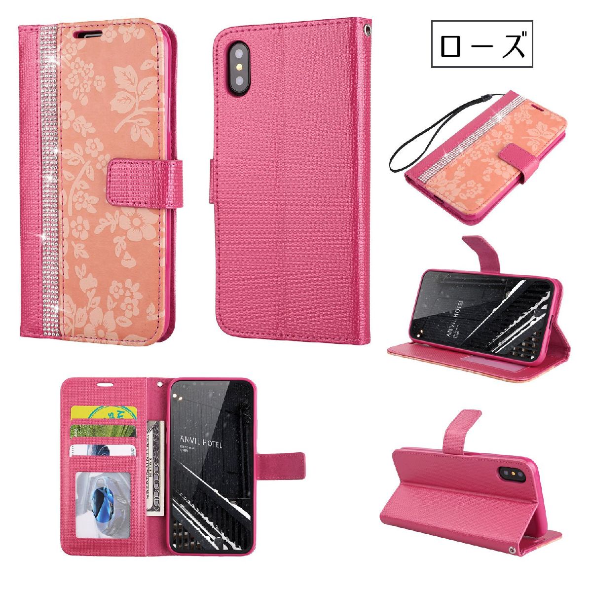 iPhoneカバー iPhoneケース 手帳型ケース 手帳型カバー ストラップ付き カードポケット付き フェイクレザー ラインストーン キラキラ 花柄 おしゃれ きれいめ 上品 可愛い かわいい スマホカバー スマートフォンケース 携帯カバー 保護ケース