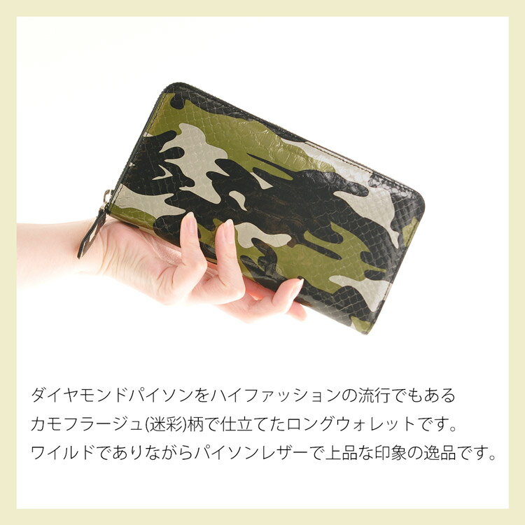 商品詳細 ●特長カード14枚収納/ラウンドファスナー/一枚革/パスポートが入る/通帳が入る ●デザインダイヤモンドパイソンをハイファッションの流行でもあるカモフラージュ(迷彩)柄で仕立てたロングウォレットです。