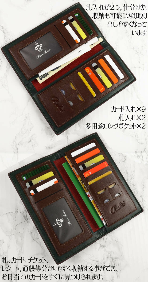また、カード入れは9ヶ所で、札入れ2ヶ所、フリーロングポケットは2ヶ所と 収納も満足にいく財布です。