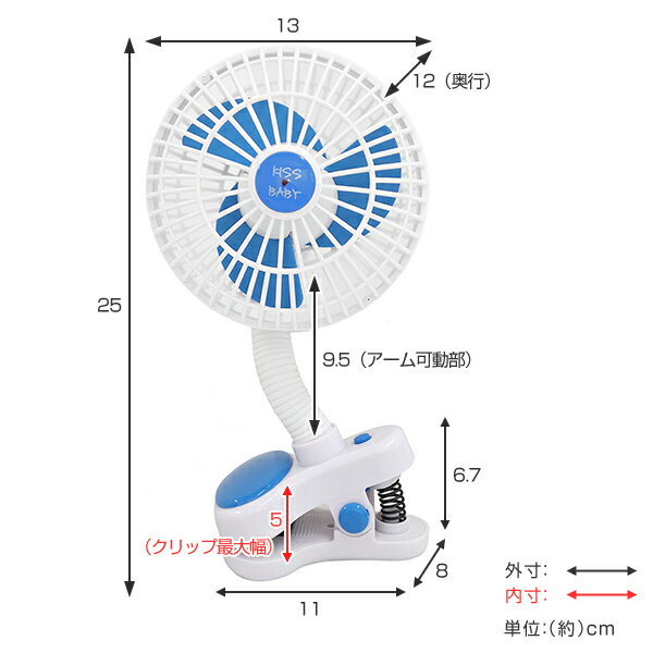サイズ約 幅13×奥行12×高さ25(アームを伸ばした状態)(cm)クリップ最大幅:約5cm重量:約200g内容量1台材質本体:ABS羽根:EVAカラーブルー、ブラック生産国中国製備考対応乾電池:単3アルカリ乾電池2本対象年齢:7ヶ月〜36ヶ月※防水機能はありません※乾電池は付属しません商品区分おでかけ用品カテゴリから探す●お出かけに便利な電池式の扇風機です。