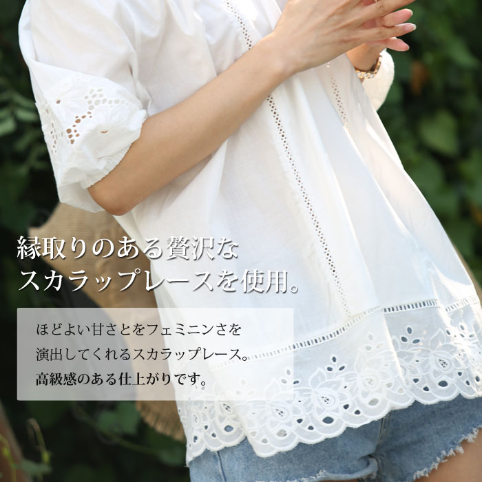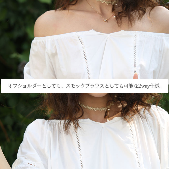 【メール便で送料無料】【レビューを書いて10%OFFクーポンGET】オフショルダー&スモックの2WAY スカラップレース 五分袖ナチュラルコットンブラウス レースブラウス シャツブラウス チュニックブラウス 花柄レース 半袖 七分袖 マタニティ トップス 白 薄手 春夏 レディースオフショルダー&スモックの2WAYデザインスカラップレース 五分袖ナチュラルコットンブラウス 【メール便で送料無料】 袖口と裾に施したスカラップレースが高級感があって可愛い。