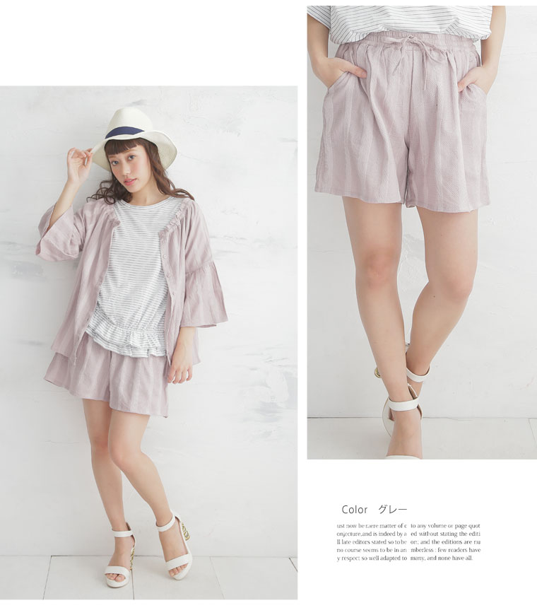 【GBR2026/09グレー、85ネイビー】/【4/19】 【楽天BOX受取対象商品(レディースファッション)】モデル 身長【160cm】 【M-4L(タグM-L)サイズ着用】 コーデ商品…インナー ストライプ柄のドビー生地を使用し、オシャレに着こなす上下セットアップ ブラウスは2WAYで使えるからとっても便利♪